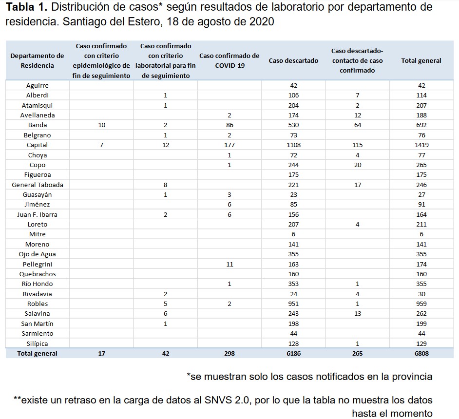 Los casos positivos registrados este miércoles corresponden a controles, no son nuevos, Añatuya (1), Las Termas de Río Hondo (1) y el resto de Capital y La Banda. Con la confirmación de 33 casos el numero de positivos de Covid-19 suma 384 casos en toda la provincia. Desde el inicio de la pandemia se confirmaron 444 casos en total. Hay 8221 casos descartados a la fecha.