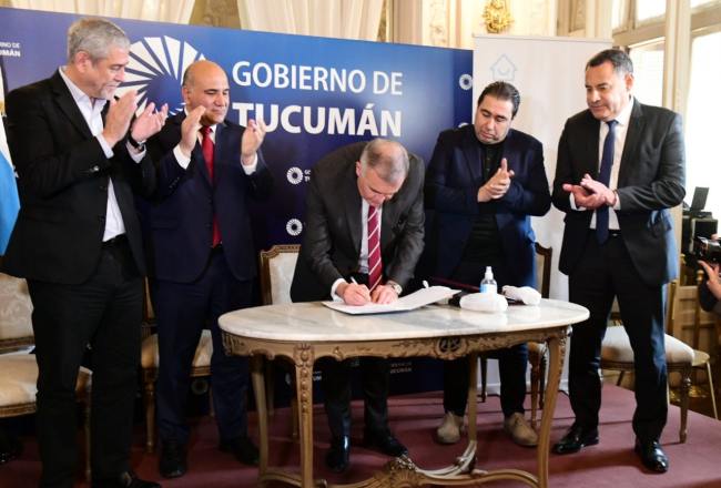 TUCUMAN.- El gobernador, Osvaldo Jaldo, junto el jefe de Gabinete de la Nación, Juan Manzur, y al ministro de Desarrollo Territorial y Hábitat de la Nación, Jorge Ferraresi, encabezaron la firma de actas para la adjudicación y contratación de obras de la construcción de viviendas en la capital tucumana, esta mañana, en el Salón Blanco de la Casa de Gobierno. El proyecto del nuevo emprendimiento habitacional contará con 1.659 viviendas, 1.491 lotes con servicios y 50 locales comerciales.