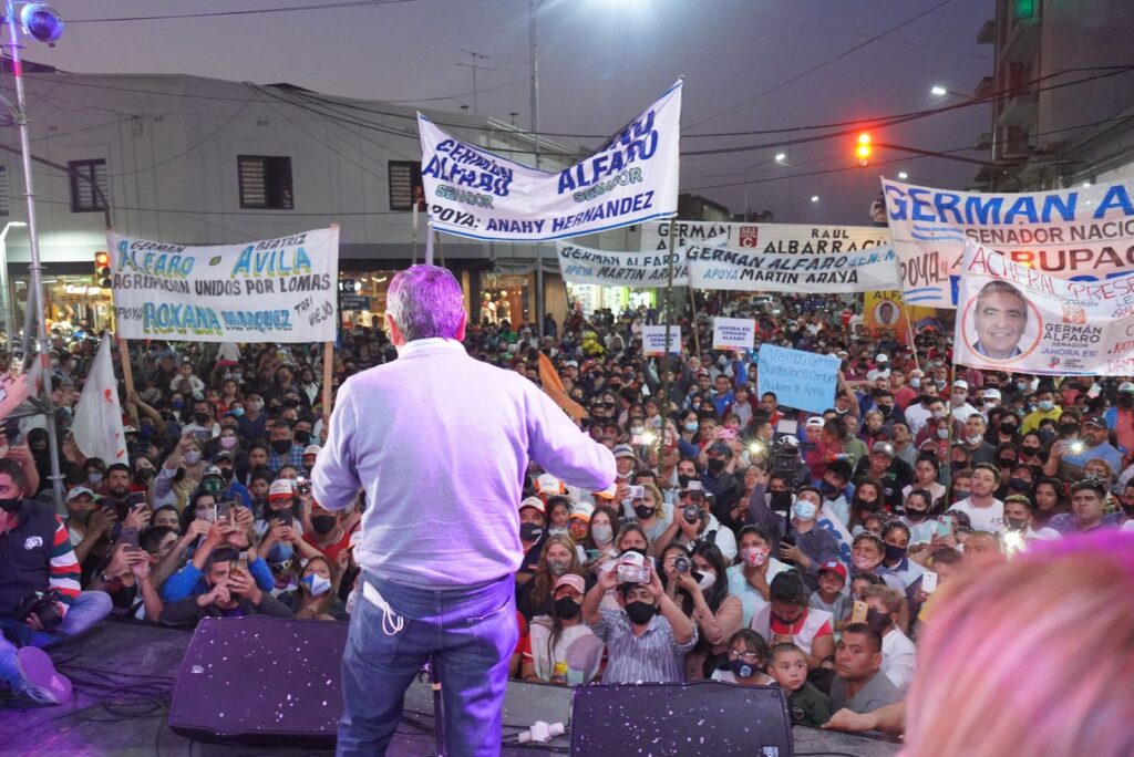 El acto en la “Perla del Sur” tuvo un cierre a toda música, con la actuación del renombrado artista popular Sergio Galleguillo y su tema más emblemático, “El Camión de Germán”, que animó los actos y reuniones del alfarismo durante toda la campaña de cara a las primarias del domingo. Fue el propio Alfaro quien, desde el escenario, se encargó de presentar al cantante riojano. “No queremos tirarles más pálidas de las que ya se dieron. Queremos despedirnos en esta campaña con alegría, por eso Sergio Galleguillo se subió al camión de Germán y les pido que lo recibamos con aplausos y alegría”, arengó el líder de Juntos para Construir.