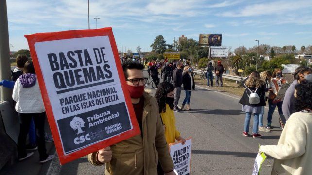 Mientras los manifestantes se iban concentrando en las inmediaciones del puente, se podía ver claramente una columna de humo en las islas al norte de Rosario, como una provocación a la anunciada protesta verde.