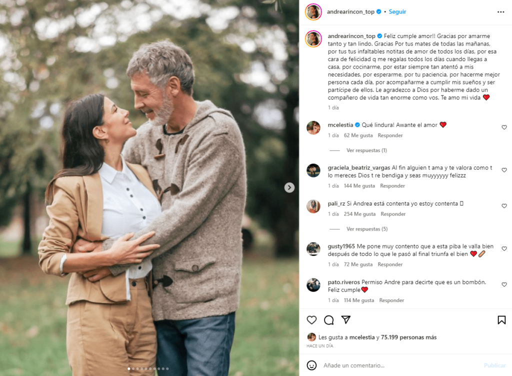 “Le agradezco a Dios por haberme dado un compañero de vida tan enorme como vos. Te amo, mi vida” cerró Rincón enamorada.