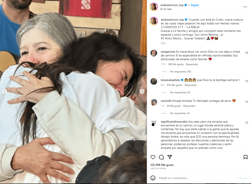 En las redes sociales muchos usuarios felicitaron a Rincón por su decisión: “Hay mucha necesidad de Dios en la farándula, intentos de suicidios, ataques de pánico, vicios, alcohol y drogas, que bueno Andrea Rincón pudo restaurar su vida a través de la fe.. Jesús es el camino.. ojalá todos puedan encontrar la paz..” escribió una usuaria.