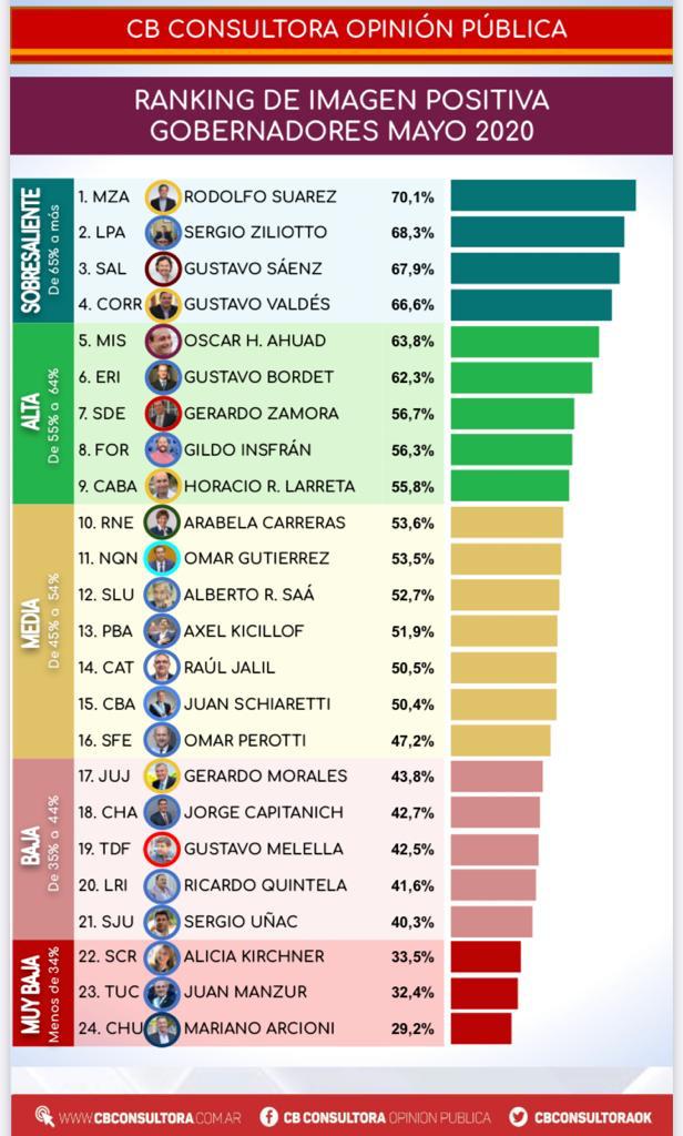 Una encuesta realizó un ránking de la imagen de los gobernadores de todo el país. El gobernador de Mendoza, Rodolfo Suárez, encabeza la tabla de mejor imagen con un 70 por ciento de aprobación. En la otra punta, el gobernador de Chubut, Mariano Arcioni, no llega al 30 por ciento de aprobación. El conflicto con los estatales de su provincia es determinante: hace dos meses que no cobran el sueldo o lo hacen a cuentagotas. Recordemos que Arcioni otorgó aumentos salariales durante la campaña para su reelección que luego no cumplió.