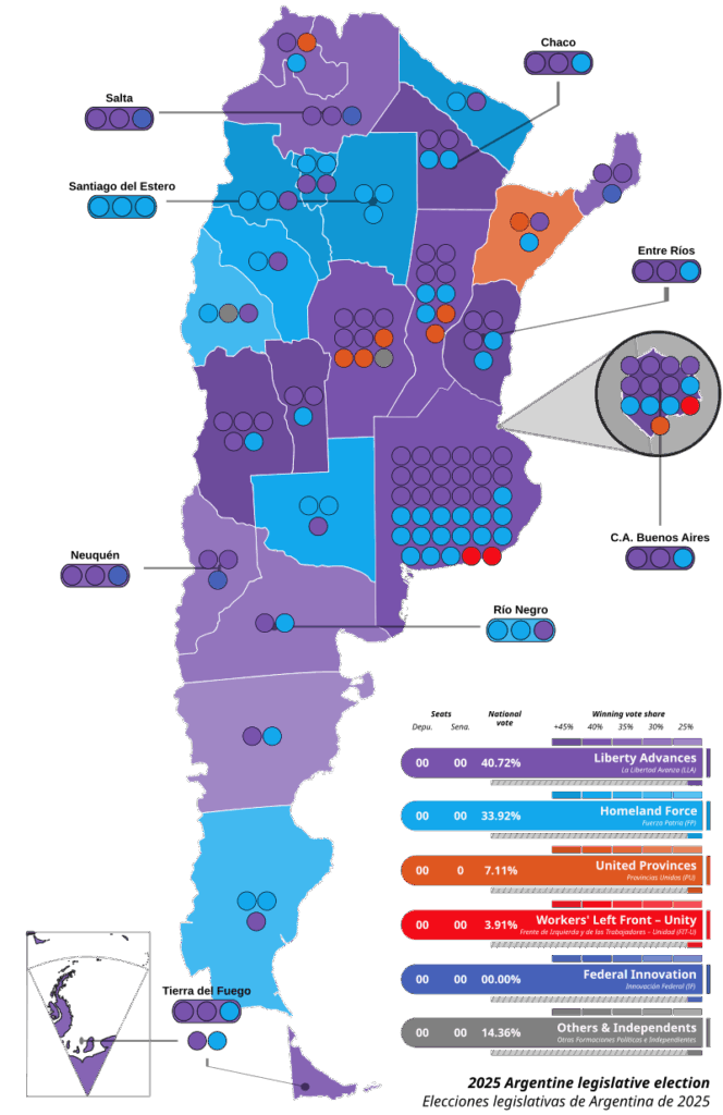 Las elecciones legislativas de 2025, celebradas el 26 de octubre, confirmaron un cambio estructural en el sistema político argentino. Con el 46,7 % de los votos válidos a nivel nacional, La Libertad Avanza (LLA) se impuso en 15 de las 24 circunscripciones, consolidando una presencia que trasciende el fenómeno presidencial de 2023. Los datos oficiales y el escrutinio provisorio -publicados por la Dirección Nacional Electoral (DINE) y compilados por distintas fuentes- muestran una recomposición inédita: el peronismo fragmentado y los frentes provinciales disputan espacio en un Congreso donde ninguna fuerza tiene quórum propio.