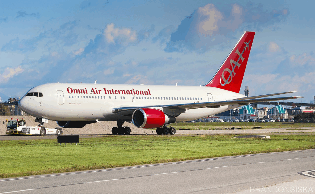 El avión de la empresa Omni Air International, un Boeing 767-300 con capacidad para 247 pasajeros, que fue rentado por la administración de Donald Trump, en Washington. Partirá a primera hora de la mañana, desde un aeropuerto que no fue revelado.