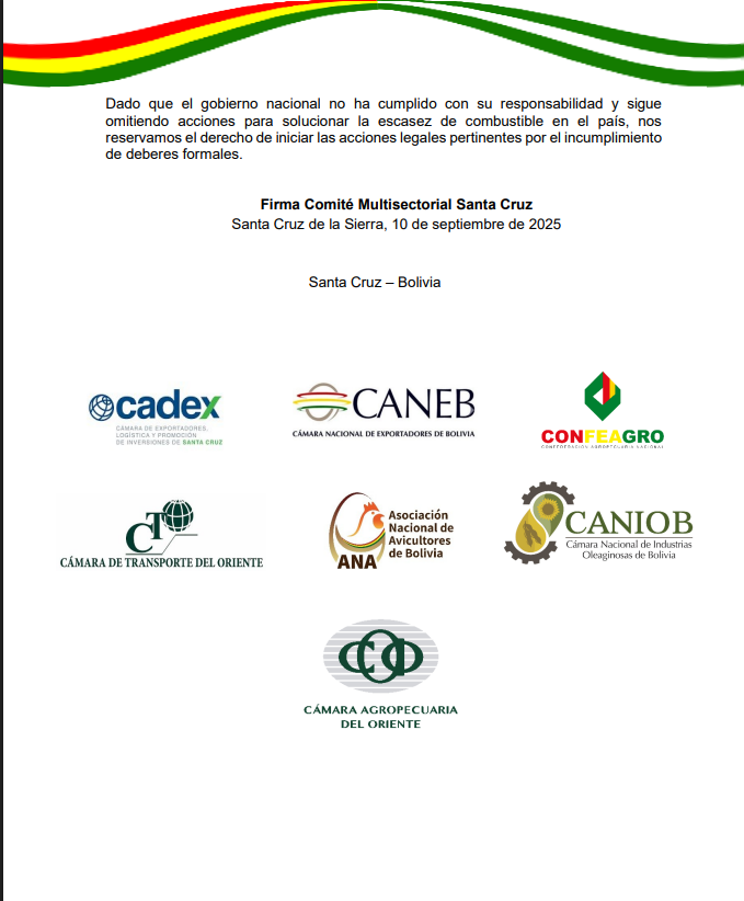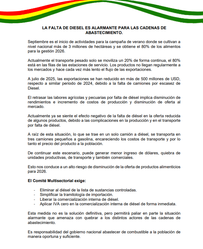 El referente de Cadex explicó que hasta julio pasado, las exportaciones de Bolivia cayeron en U$S 500 millones respecto al mismo periodo de 2024, tendencia que podría agudizarse si no se garantiza el suministro de diésel.