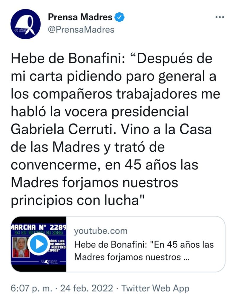“Después de mi carta pidiendo paro general a los compañeros trabajadores me habló la vocera presidencial Gabriela Cerruti. Vino a la Casa de las Madres y trató de convencerme. En 45 años las Madres forjamos nuestros principios con lucha”, dijo Bonafini desde la cuenta de las Madres.
