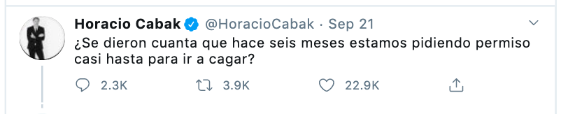 El ida y vuelta con sus seguidores y no tanto, continúo con todo tipo de expresiones a las cuales no dudó en responder con un detalle de todo lo que necesitaba autorización: «1: permiso para circular, 2: para trabajar, 3: para correr, 4: para caminar, 5: para ver a hijos, 6: para ir al médico, 7: para ir al banco, 8: para cruzar de provincia a Capital, 9: para que ingrese alguien a tu domicilio y 10: para encontrarte con tu familia».