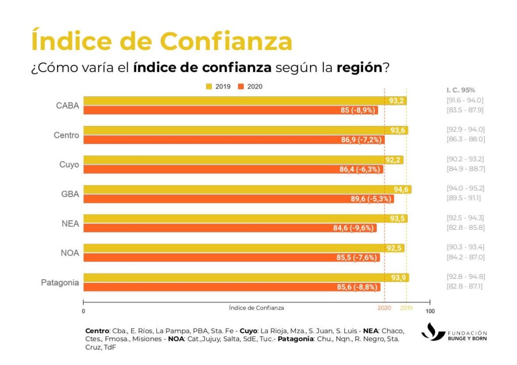 El índice de confianza 2020 resultó del 86,9 a nivel país, que si bien se mantuvo dentro de parámetros altos, disminuyó 7,2% respecto de 2019. Este índice se realiza a partir de la ponderación de las personas sobre la importancia, la seguridad y la efectividad de las vacunas.