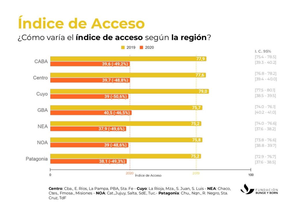 En cuanto al índice de acceso 2020 su valor fue de 39,5, un 48% menor que el año anterior. Esto se sostiene en todas las regiones del país y en los distintos niveles educativos.