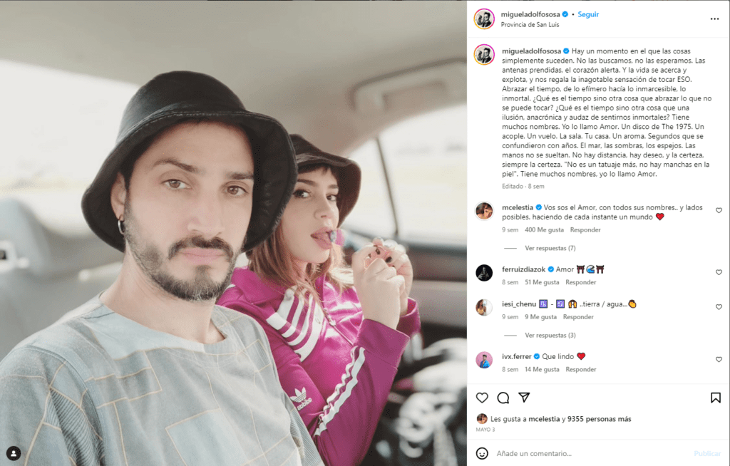Desde que anunciaron su relación, la pareja de artistas se mostraron muy enamorados en las redes sociales. Hace unas semanas, el baterista publicaba en sus redes un sentido mensaje para Celeste.“¿Qué es el tiempo sino otra cosa que abrazar lo que no se puede tocar? ¿Qué es el tiempo sino otra cosa más que una ilusión, anacrónica y audaz de sentirnos inmortales? Tiene muchos nombres. Yo lo llamo Amor” escribió el integrante de Catupecu Machu junto a una foto con su novia.