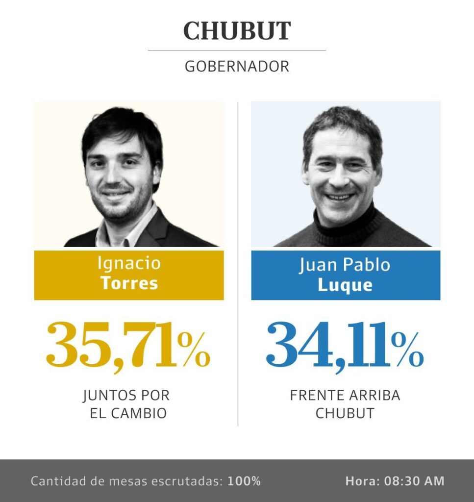 Ignacio Torres festejó un triunfo con un final muy «apretado» . El candidato de peronismo, Juan Pablo Luque, no reconoció la derrota.