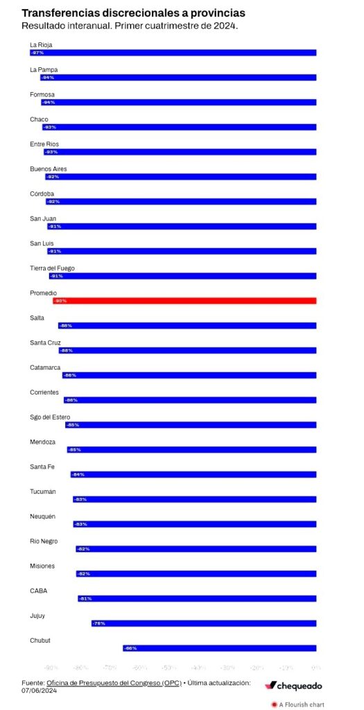 De acuerdo al análisis de la Oficina de Presupuesto del Congreso de la Nación, las provincias de La Rioja (97%), La Pampa (94%) y Formosa (94%) son las que más recursos extracoparticipables o discrecionales «perdieron» con respecto al primer cuatrimestre de 2023, mientras que Chubut (66%), Jujuy (76%) y la Ciudad de Buenos Aires (81%) son las que menos vieron reducidos ese tipo de ingresos. El promedio nacional fue del 90%.