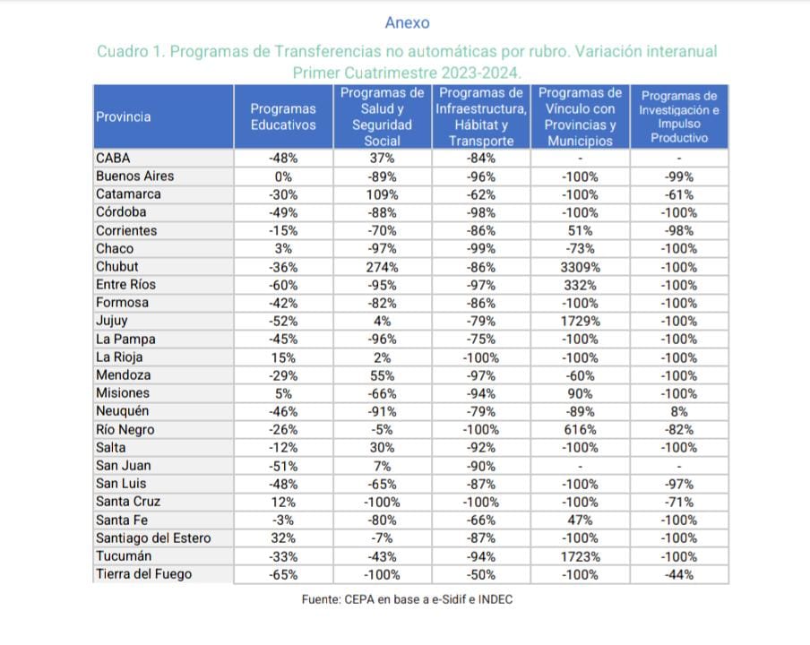 Analizando en general el estudio de CEPA todas las provincias perdieron recursos extracoparticipables respecto de 2023 en Infraestructura, pero en Vinculo con Provincias y Municipios hubo algunas que «ganaron»: Chubut recibió un 3.309% más, Jujuy el 1.729%, Tucumán el 1.723%, Río Negro el 616%, Entre Ríos el 332%, Misiones el 90%, Corrientes un 51% y Santa Fe el 47%. En el caso de «Investigación e Impulso Productivo» solo Neuquén recibió el 8% más, mientras que 14 provincias no recibieron ningún aporte nacional.