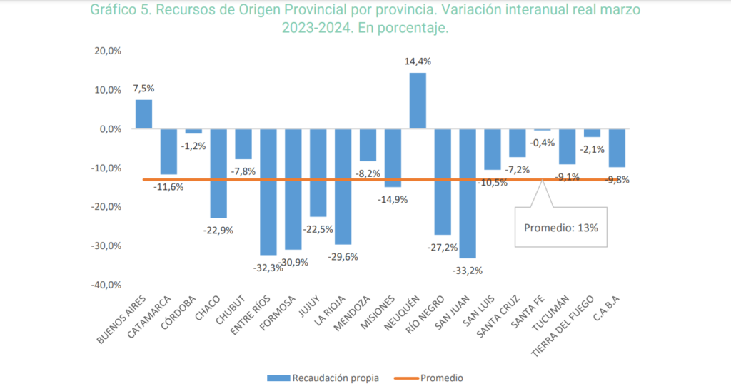 Finalmente el estudio del Centro CEPA explica que hubo provincias que también vieron reducida su recaudación propia en este mismo periodo, como San Juan (-33%), Entre Ríos (-32%), Formosa (-31%) y La Rioja (-30%)