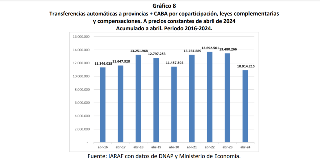 Por su parte, el IARAF concluyó que «el monto de las transferencias automáticas reales totales del primer cuatrimestre (coparticipación), de confirmarse la inflación supuesta del 8,8% mensual en abril, sería el peor de los últimos 9 años».