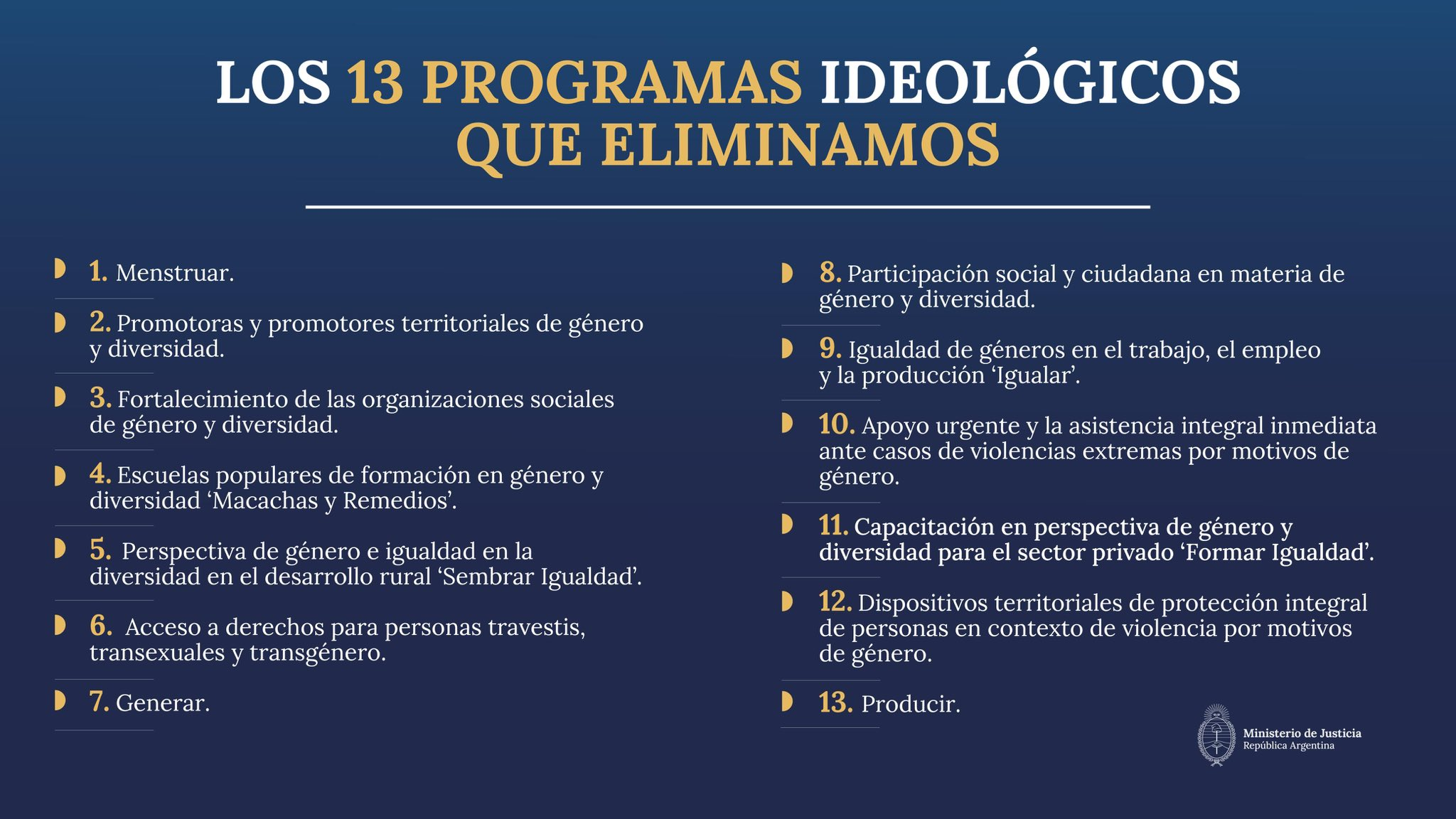 «Eliminamos 13 programas ideológicos creados por el kirchnerismo, que eran financiados por todos los argentinos. Entre ellos se encuentra el insólito «MenstruAR”. Los 13 programas que eliminamos son: