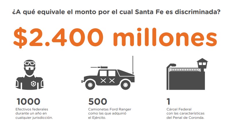Para tener una magnitud de lo que significa este retaceo de recursos para la provincia, sirve como parámetro señalar que este año, el Ejército Argentino adquirió camionetas reforzadas por un valor de 4 millones de pesos cada una. Lo que se resta de inversión en Santa Fe equivale a más de 500 camionetas de este tipo. Por otra parte, ese monto, a valores actuales, es lo que cuesta aproximadamente desplegar más de 1000 integrantes de la Fuerzas Federales por un año en la provincia, incluyendo equipo de comunicaciones, logística, y demás herramientas.