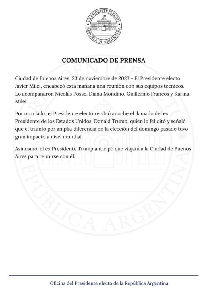 BUENOS AIRES.- En la mañana de hoy el ex-presidente de Estados Unidos, Donald Trump llamó por teléfono al presidente electo Javier Milei, para felicitarlo por el triunfo en el balotaje del domingo, y le dijo que ese resultado “está teniendo impacto mundial”.