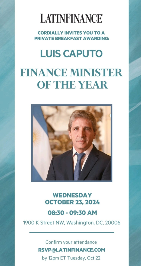EE.UU.- En las últimas horas tomó estado público que el ministro de Economía, Luis Caputo, será premiado en Washington como “Ministro de Finanzas del Año», un reconocimiento que entrega anualmente la influyente revista especializada, LatinFinance.