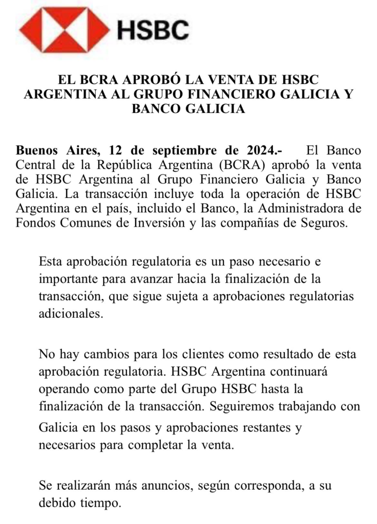 HSBC Argentina indicó que la aprobación del BCRA, es un “paso necesario e importante” en el proceso de finalización de la venta, aunque aclaró que aún están pendientes otras aprobaciones regulatorias antes de concretar la transacción. Hasta entonces, HSBC seguirá operando en el país como parte de su grupo internacional.