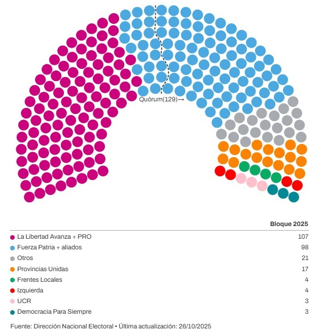 Fuerza Patria se ubicará como segunda fuerza con 98 diputados. Por su parte, los distintos espacios que integran Provincias Unidas sumarán 17 escaños, luego de incorporar 8 nuevos diputados, y podrían transformarse en los árbitros del quórum y las mayorías simples.