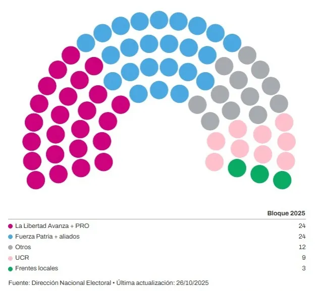 La Cámara Alta quedó «equilibrada». La Libertad Avanza y el PRO alcanzaron 24 escaños, la cifra necesaria para sostener los vetos presidenciales. De esa manera, podrían constituirse como la primera minoría si el peronismo continúa dividido en dos bloques. El tercio restante del Senado quedó conformado por 9 senadores radicales y representantes de fuerzas provinciales.