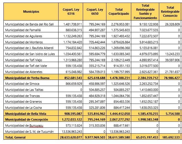 El Gobierno de la provincia giró como fondos reintegrables –ahora denominado Convenio Consensuado de Fondos Unificados– un total de 65.200 millones de pesos a 17 de los 19 municipios entre enero y julio de este año. Sólo San Miguel de Tucumán y Burruyacu no están adheridos a este convenio, es decir, se mantienen con lo que perciben por coparticipación.