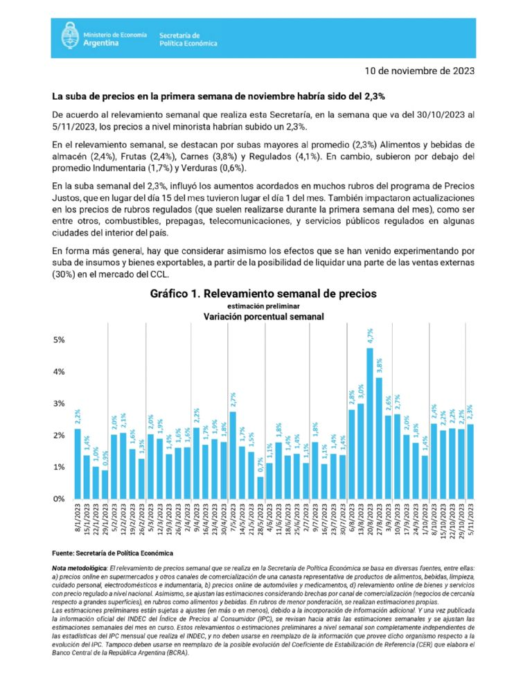 BUENOS AIRES.- La Secretaría de Política Económica que dirige Gabriel Rubinstein, hizo público un informe que indica, que en la semana que va del 30 de octubre al 5 de noviembre, la inflación fue de 2,3%, lo que representó un leve aumento en relación con la semana anterior, cuando fue de 2,2%.