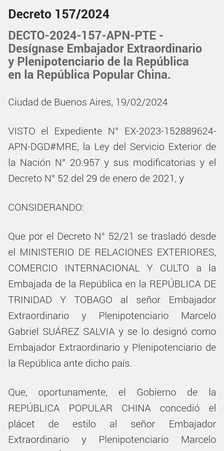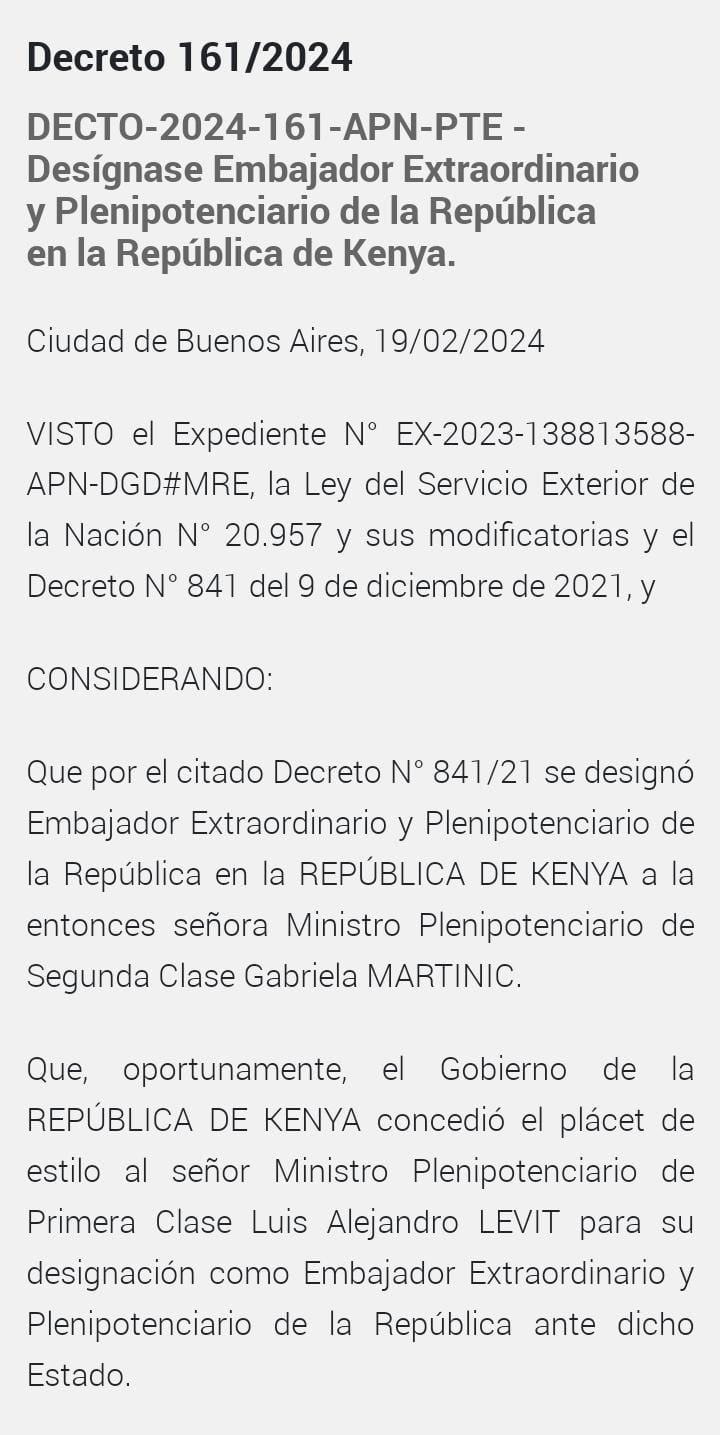 Como embajador en China se nombró a Marcelo Salvia, por medio del Decreto 157/2024; y a Luis Levit, en Kenia, según el Decreto 161/2024, firmado por el presidente Javier Milei y por la canciller Diana Mondino.