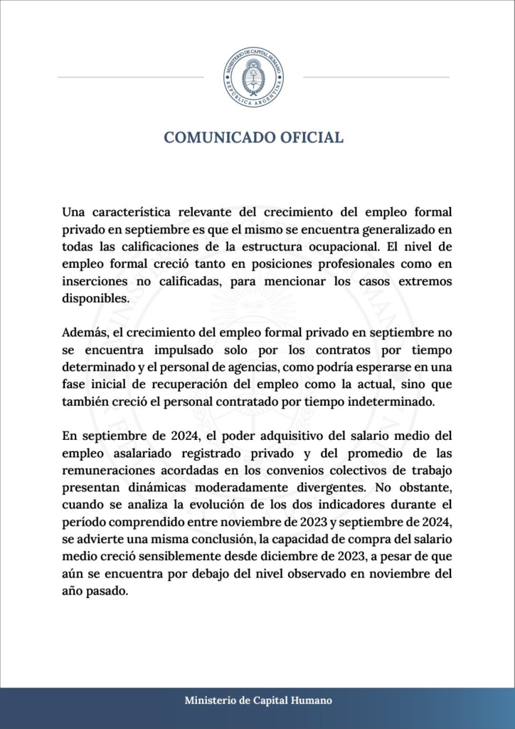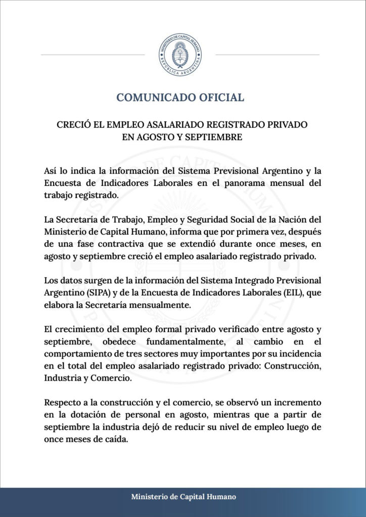 Datos oficiales divulgados por la Secretaría de Trabajo, indican que el empleo registrado creció en agosto y septiembre, un fenómeno que atribuyen a la implementación de la reforma laboral, conocida como «Ley de Bases», junto con la confianza que las políticas económicas recientes han generado en el ámbito empresarial.