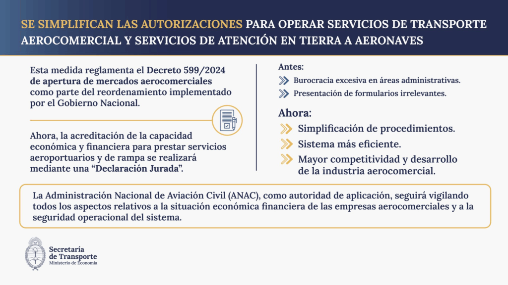 Esta medida, que reglamenta el Decreto 599/2024 de apertura de mercados aerocomerciales, forma parte del reordenamiento integral de la normativa aerocomercial que viene llevando adelante el Gobierno Nacional a través del Ministerio de Desregulación y la Secretaría de Transporte del Ministerio de Economía de la Nación con el fin de dotar al mercado de un entorno más competitivo, simplificando los procedimientos para obtener la autorización aerocomercial, desburocratizando al sector y haciendo más eficientes las intervenciones de la Administración Pública Nacional.