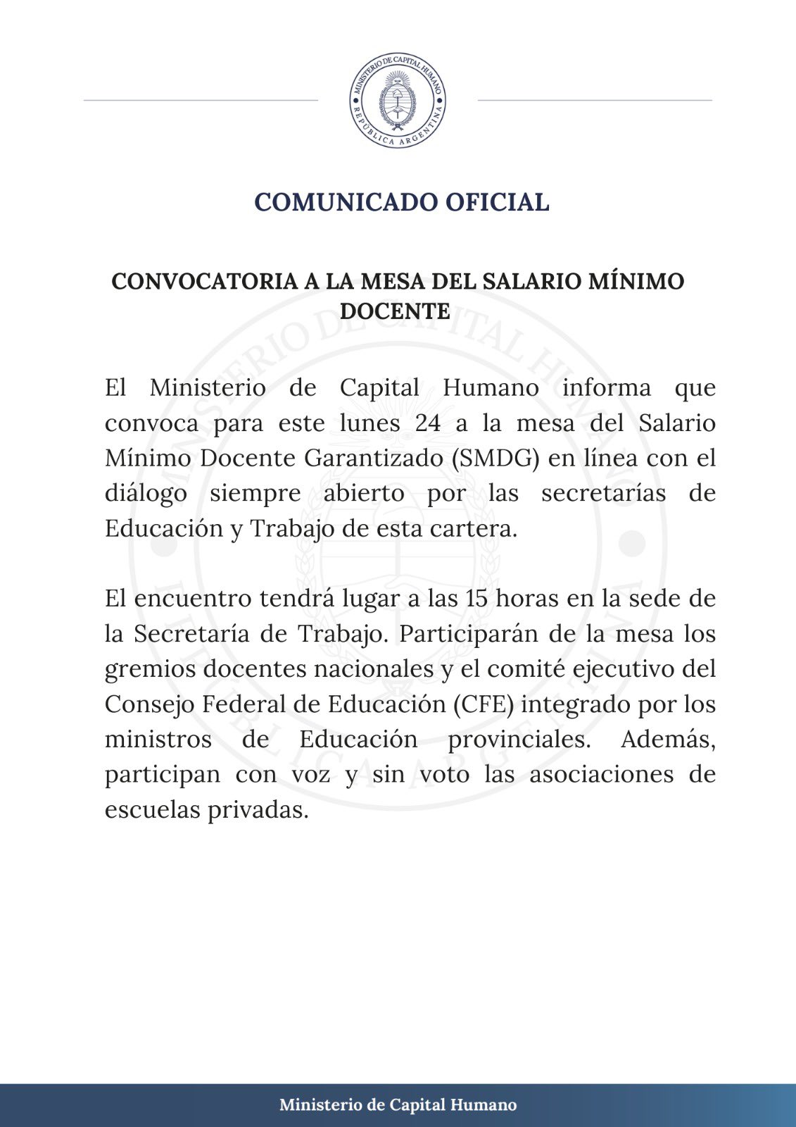 El comunicado reposteado por la ministra Sandra Pettovello dice: “El Ministerio de Capital Humano informa que convoca para este lunes 24 a la mesa del Salario Mínimo Docente Garantizado (SMDG) en línea con el diálogo siempre abierto por las secretarías de Educación y Trabajo de esta cartera”.