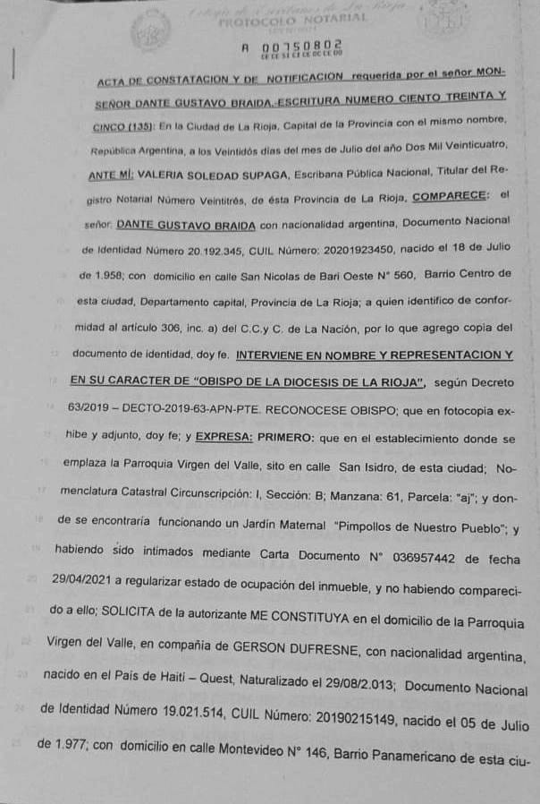 El Jardín Maternal Comunitario «Pimpollos de Nuestro Pueblo», fundado por la dirigente social Maleya Gordillo y el padre Enrii Praolini, fue intimado a desalojar las instalaciones de la Capilla Virgen del Valle del barrio Tiro Federal de La Rioja, donde funciona desde hace 28 años, por parte del obispo Dante Braida y el sacerdote Gerson Dufresne.