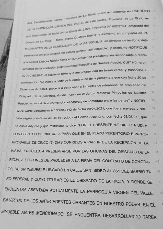 Según la intimación realizada mediante escritura pública, el obispado ya había requerido la regularización de la situación del Jardín Maternal en 2021, pero pretendía que el jardín le entregase todo su mobiliario, equipamiento y hasta los juguetes y juegos para los niños, a la iglesia.