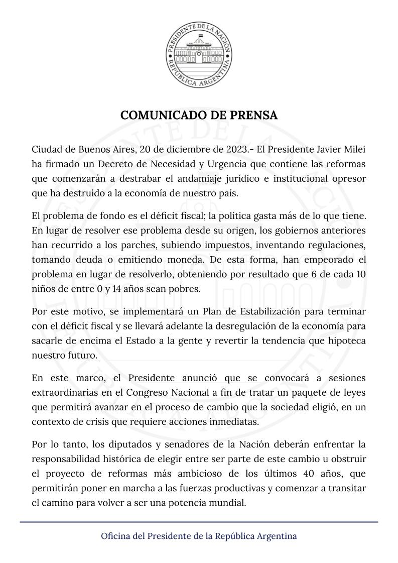 «El país iba rumbo a estrellarse con una inflación del 15.000%, ese país termina hoy. Después de décadas de fracasos, hoy comenzamos el camino de la reconstrucción«, apuntó el libertario. Asimismo, sentenció: «He firmado un DNU para desarmar el andamiaje jurídico opresor que trajo decadencia a nuestro país».