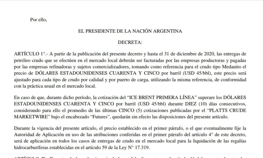 Las entregas de petróleo crudo que se efectúen en el mercado local deberán ser facturadas por las empresas productoras y pagadas por las empresas refinadoras , tomando como referencia para el crudo tipo Medanito el precio de U$S 45 por barril hasta el 31 de diciembre del 2020.