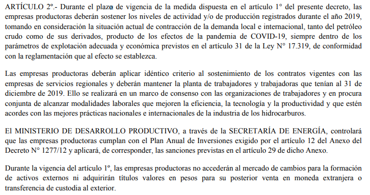 En el artículo 2° del decretó figura que las empresas productoras deberán sostener los niveles de actividad y/o de producción registrados durante el año 2019, tomando en consideración la situación actual de contracción de la demanda local e internacional, tanto del petróleo crudo como de sus derivados, producto de los efectos de la pandemia de COVID-19, siempre dentro de los parámetros de explotación adecuada y económica previstos en el artículo 31 de la Ley N° 17.319, de conformidad con la reglamentación que al efecto se establezca.