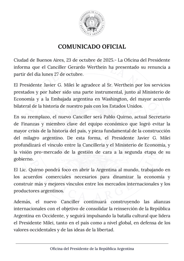 BUENOS AIRES.- Este mediodía desde la cuenta en la red social X, Oficina del Presidente de la República Argentina, comunicaron la designación de Pablo Quirno como nuevo ministro de Relaciones Exteriores, Comercio Internacional y Culto, en reemplazo de Gerardo Werthein, quien presentó su renuncia efectiva a partir del lunes 27 de octubre.