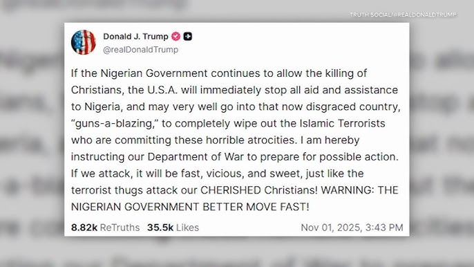 En su cuenta de la red social Truths, el presidente publicó: “Si el Gobierno nigeriano sigue permitiendo la matanza de cristianos, EEUU detendrá inmediatamente toda ayuda y asistencia a Nigeria, y muy bien podría intervenir en ese ahora desprestigiado país, blandiendo armas para eliminar completamente a los terroristas islámicos que están cometiendo esas horribles atrocidades”.