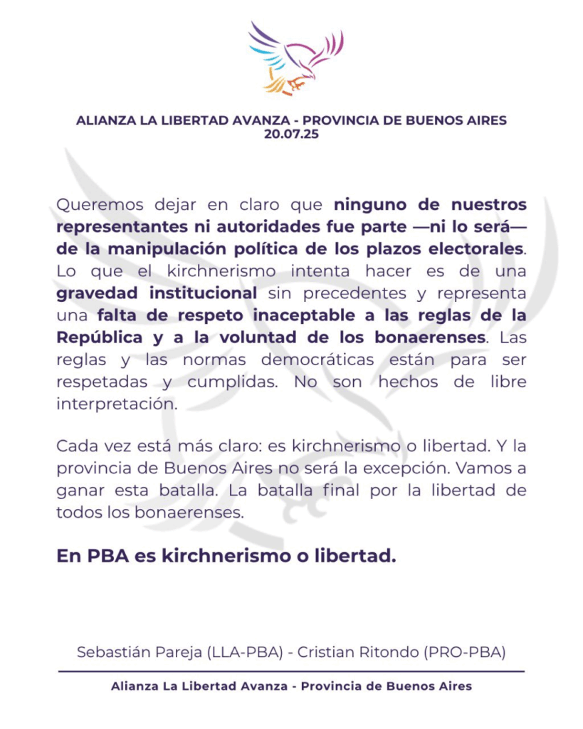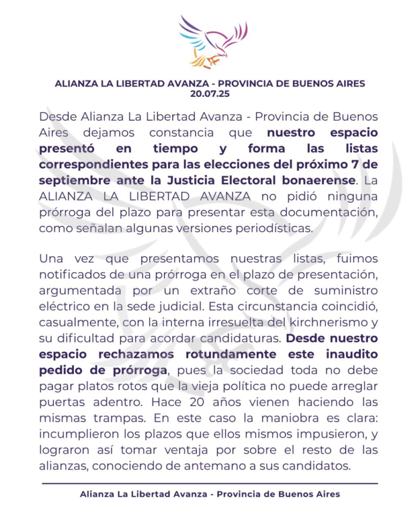 La situación se tensó tanto que, según fuentes del PJ bonaerense, la posibilidad de una ruptura fue real hasta avanzada la madrugada del domingo. El corte de luz entre las 22:30 y las 23:30 obligó a la Junta Electoral bonaerense a prorrogar el cierre del plazo legal hasta las 14:00 del día siguiente, lo que fue aprovechado por los apoderados del peronismo para terminar de afinar los nombres.