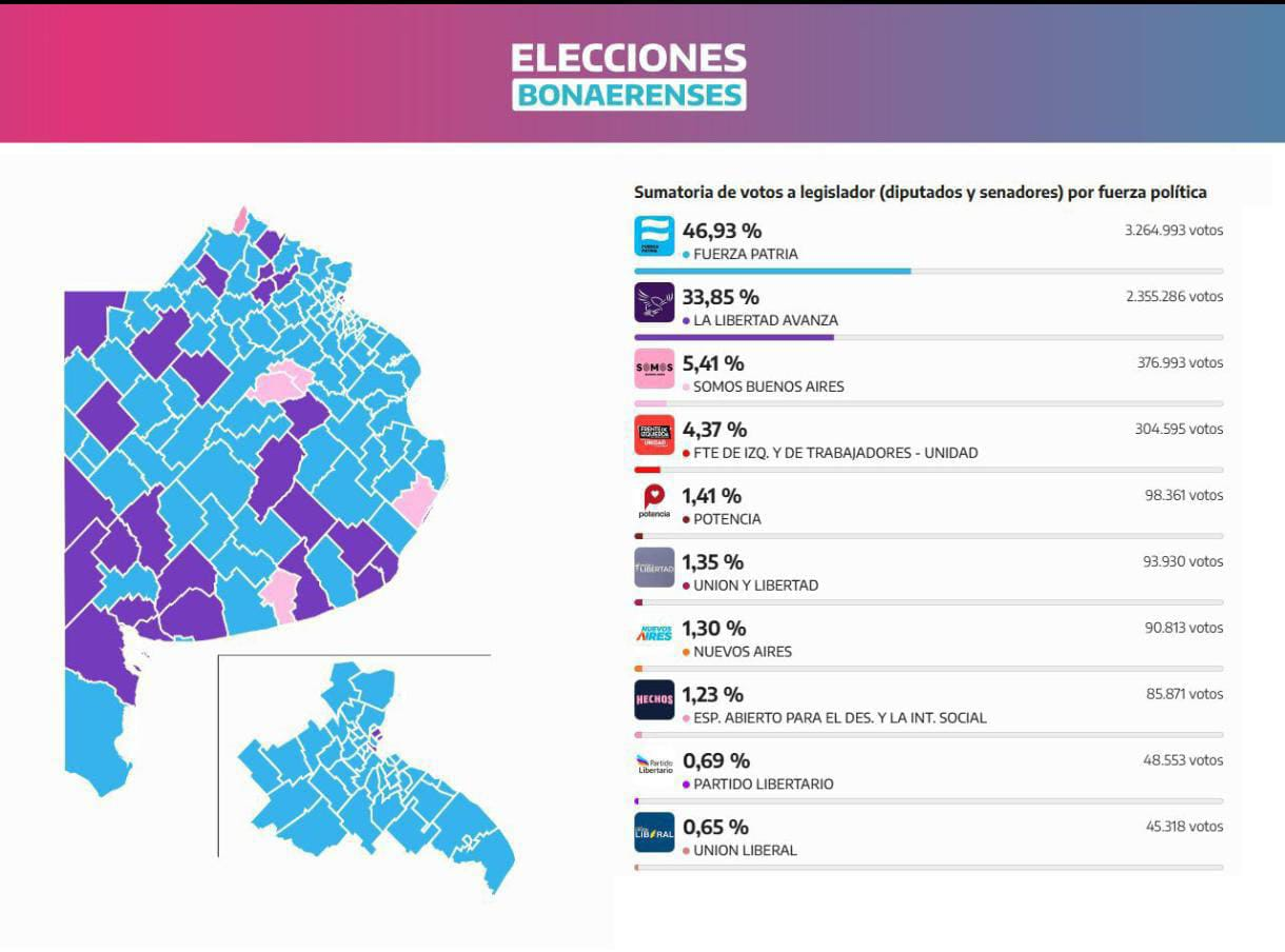 BUENOS AIRES.- Cuando el reloj marco la hora 21:00, las autoridades electorales de la provincia de Buenos Aires (PBA), informaron que Fuerza Patria obtuvo una victoria contundente, en las elecciones legislativas.