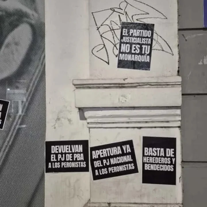 En la jornada de ayer la tensión se hizo visible con la aparición de carteles y calcomanías en la sede partidaria de Calle 54, en la ciudad de La Plata, con mensajes directos al hijo de la ex-presidente: “Basta de herederos y bendecidos”, “El Partido Justicialista no es tu monarquía” y “Máximo, el partido no es tu juguete”, «Devuelvan el PJ de PBA a los peronistas», Apertura ya del PJ nacional a los peronistas». Los afiches fueron retirados a las pocas horas, pero el mensaje quedó instalado y marcó la profundidad de la fractura interna.