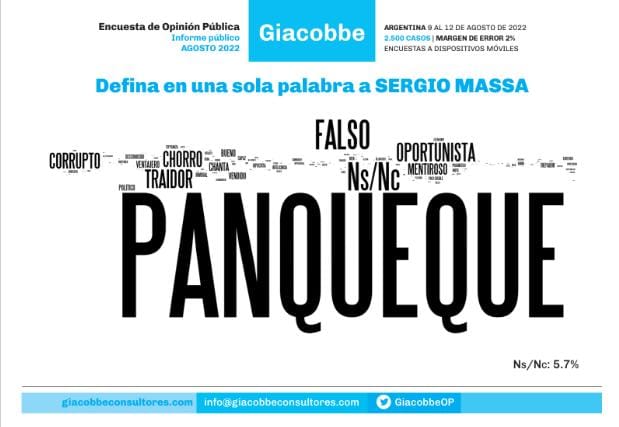 También se consulto sobre la imagen que tienen del Ministro de Economía Sergio Massa, y la gran mayoría la consideró “negativa”: 68,1%; a su vez, el 16,7% opinó “regular” y el 13,2% “positiva”. Consultados por definir al líder del Frente Renovador en tan solo una palabra, se destacó claramente “panqueque”; otras calificaciones fueron “corrupto”, “chorro”, “traidor”, “falso”, “oportunista”, “mentiroso”, “ventajero”, “chanta” y “vendido”.