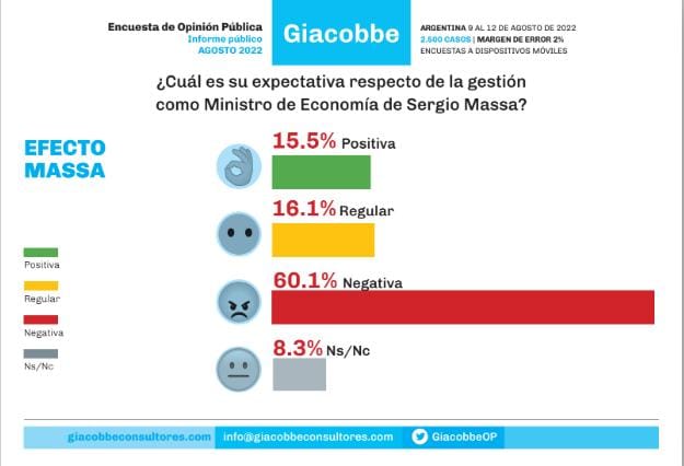 Los conceptos sobre las expectativas que genera el «superministro» son: el 60,1% se inclinó por “negativa”; tan solo el 15,5% auguró un pronóstico “positivo” y el 16,1% optó por “regular”. En esta línea, ante la pregunta sobre cómo queda el gobierno tras la incorporación del tigrense al Gabinete, el 47,7% piensa que “está igual que antes”; el 34,2% sostiene que “está más débil” y el 17,3% que “está más fuerte”.