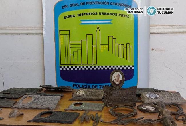 El acusado fue detenido cuando intentaba escapar por avenida Francisco de Aguirre al 500, con una mochila, en donde llevaba todos los objetos que había sustraído del cementerio. Personal policial logro recuperar aproximadamente 25 de placas robadas.