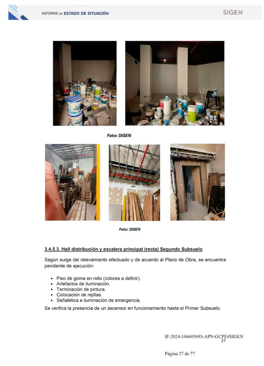En cuanto a las instalaciones eléctricas, el relevamiento identificó fallas graves, como tendidos fuera de normativa que podrían derivar en choques eléctricos o incendios. Además, algunos materiales de construcción, como cemento y pintura, se encuentran en estado de degradación debido al tiempo transcurrido desde el inicio de la obra, lo que pone en evidencia la falta de mantenimiento y planificación.