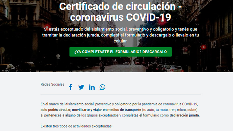 En el marco del aislamiento social, preventivo y obligatorio por la pandemia de coronavirus COVID-19, desde el gobierno nacional señalaron que «solo podés circular, movilizarte y viajar en medios de transporte (tu auto, tu moto, tren, micro, subte) si pertenecés a alguno de los grupos exceptuados y completás el formulario como declaración jurada».