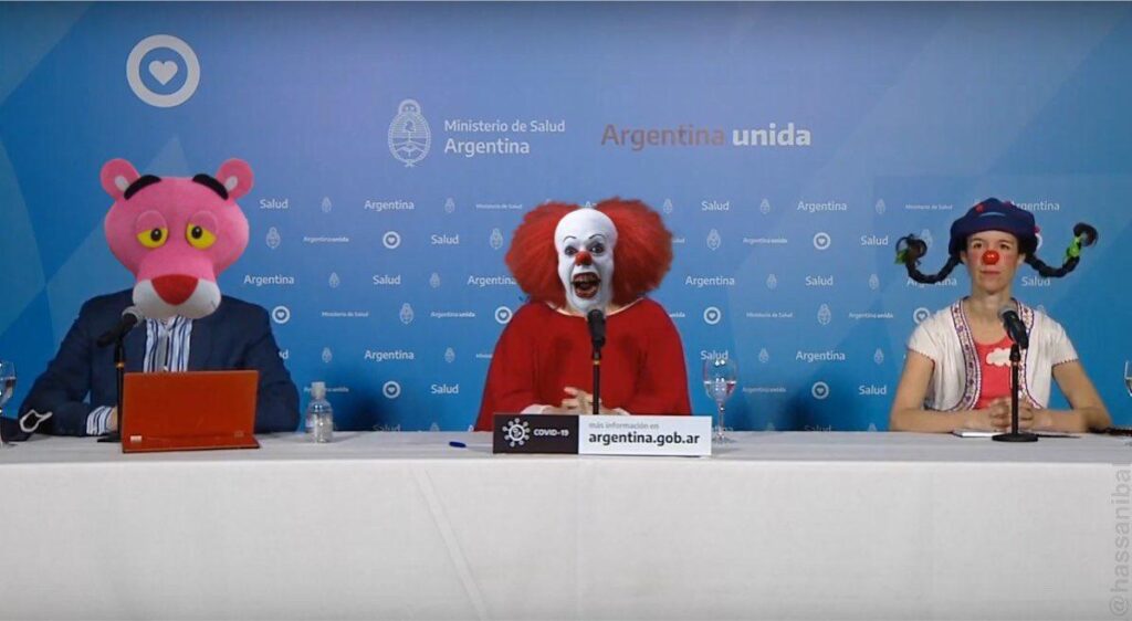 Lo curioso del domingo fue la presentación del Reporte diario sobre la situación sanitaria y epideomológica de coronavirus con un tono «payasesco» para acompañar a los niños en su día.