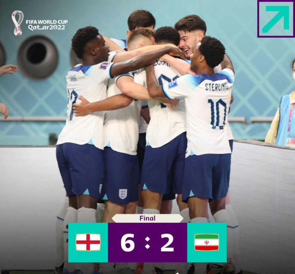 Los goles de Inglaterra los marcaron Jude Bellingham, Bukayo Saka (2), Raheem Sterling, Marcus Rushford y Jack Grealish. Los descuentos iraníes fueron concretados por el atacante del Porto de Portugal Mehdi Taremi, en ambas ocasiones (una de ellas, mediante un penal que sancionó el VAR).